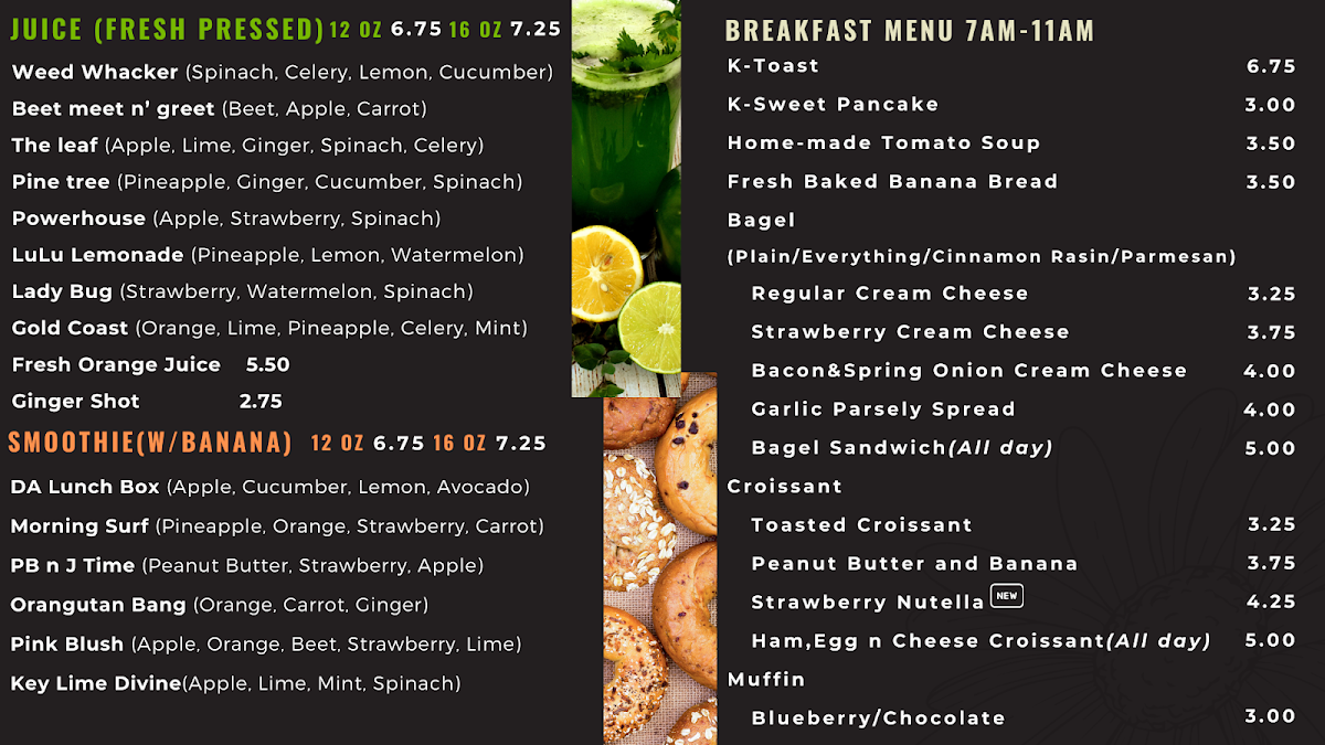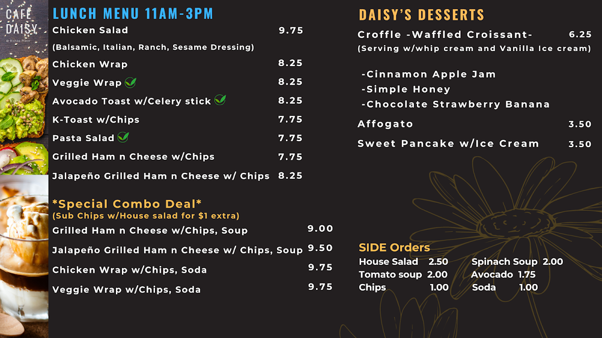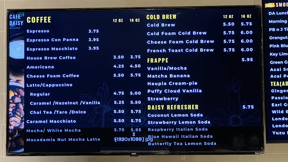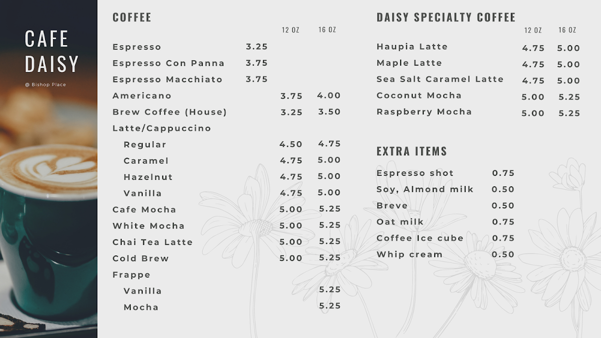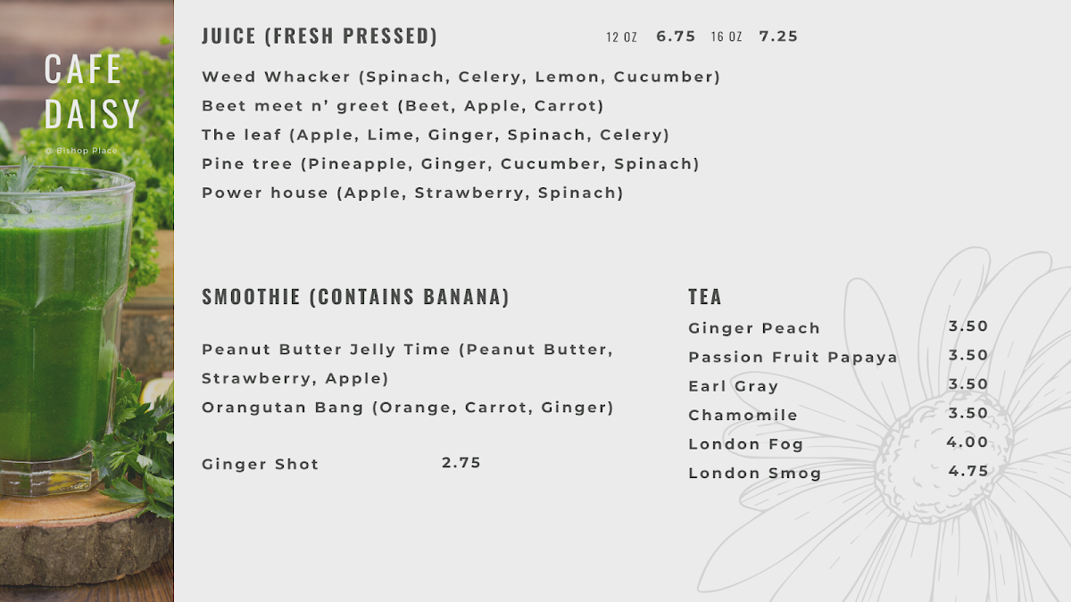 Welcome to Cafe Daisy, a hidden gem nestled in the heart of Honolulu at 1132 Bishop St #131. This cozy cafe is designed for both residents and tourists seeking a delightful brunch spot. The menu boasts an impressive range of offerings, including expertly brewed coffee and tea, revitalizing fresh pressed juices and smoothies, as well as a variety of hearty breakfast and lunch options.